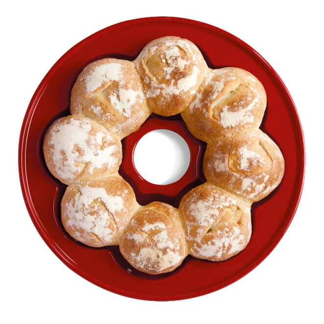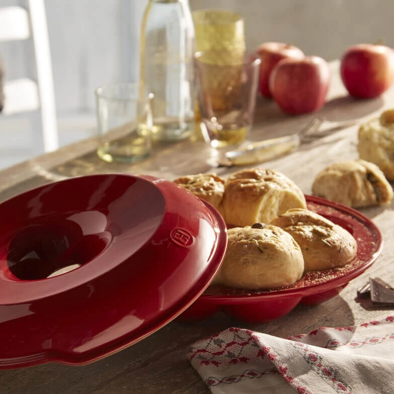 De Emile Henry kroonvormige broodbakpan is gemaakt van rood geglazuurd aardewerk. De broodbakpan heeft een diameter van 30,5 cm. Dankzij het materiaal van de broodbakvorm bakt u brood met een krokante korst en een zachte binnenkant. Dankzij de bollen in kunt u eenvoudig 8 kleinere broodjes of brioches per keer bakken.